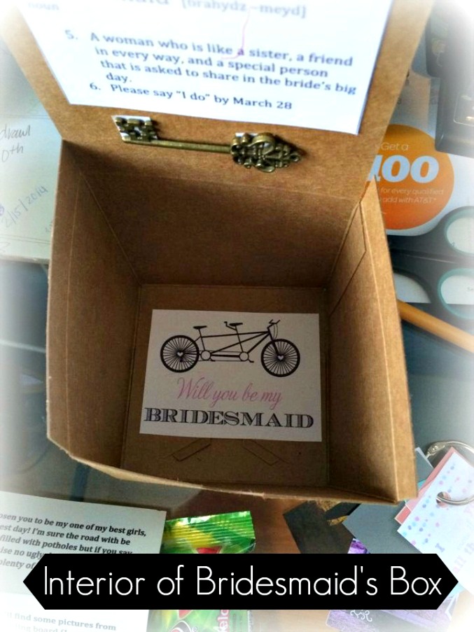 Next, I went back to my Pinterest boards and printed out some of the ideas that had inspired me; I hole-punched these ideas and my color swatches and used the metal rings to make a tiny flip book for each of my ladies. I also went online and found a free printable with a vintage bicycle and “will you be my bridesmaid/maid of honor”! At http://bit.ly/1d7tDnx there are several customizable bridesmaids’ cards! I chose my colors, printed the cards out on matte photo paper and trimmed them down to size. For the definition cards, (attached to the lid of the box with photo mounting squares) I also used matte photo paper.