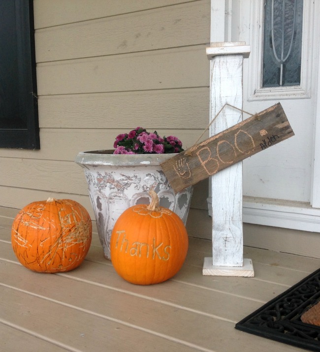 I sprayed a scrap of pallet wood white and left one piece natural; I thought it would be cute to engrave our street number on one piece and my son wanted to write “boo” on his. The only money spent on this front door makeover was purchasing three mums to plant in my front planters. It’s great to repurpose leftover wood in to new projects.