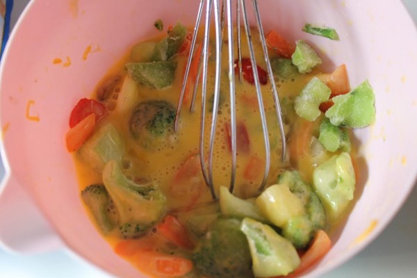 - In a large bowl whisk eggs, vegetables, cheddar cheese, salt and pepper until well combined.