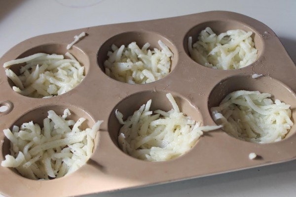 - Divide thawed hash browns evenly, pressing into the bottom of muffin cups and slightly up