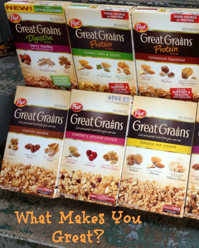Post Great Grains Cereal is celebrating greatness with their new whole grain cold cereals in 8 different varieties and they are celebrating you! What Makes You Great? Join the campaign with Great Grains on Facebook by using the hashtag #GreatGrains and sharing what makes you great!