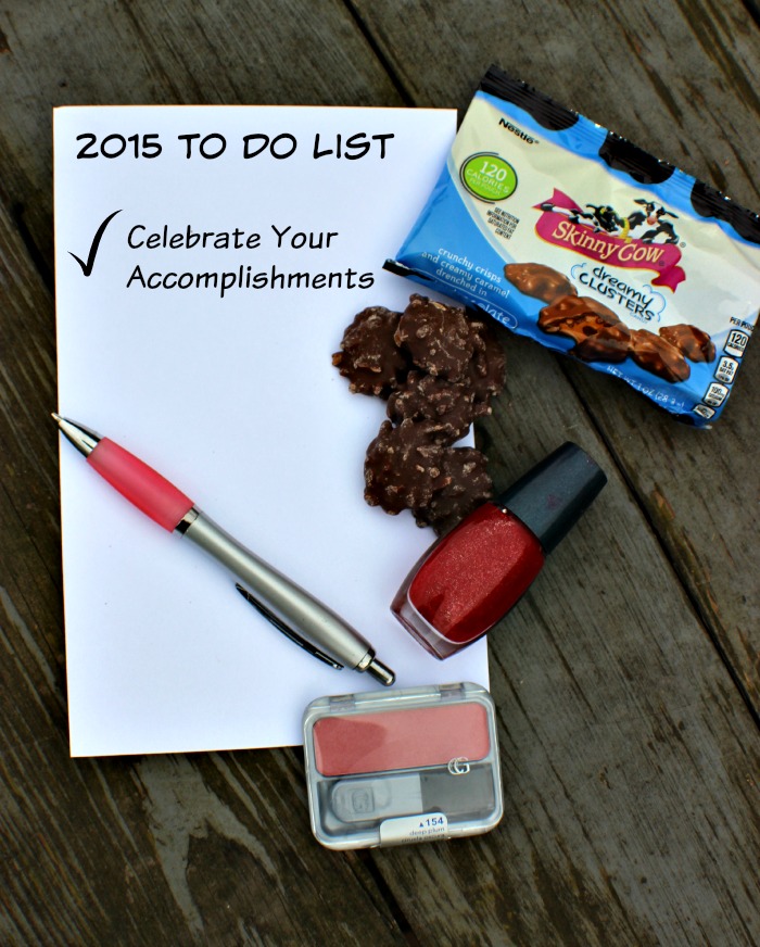 Celebrate your accomplishments and successes has made it’s way on to my 2015 To Do List. Whether it’s a personal success, family success or just because, take the time to celebrate. Buy a new nail polish, try out some new makeup, grab a treat, like SKINNY COW® Dreamy Clusters Milk Chocolatey Candy. SKINNY COW® Dreamy Clusters are only 120 calories and satisfy my need for a sweet snack. Your reward doesn’t need to be costly or extravagant, just a way to celebrate that you will enjoy.