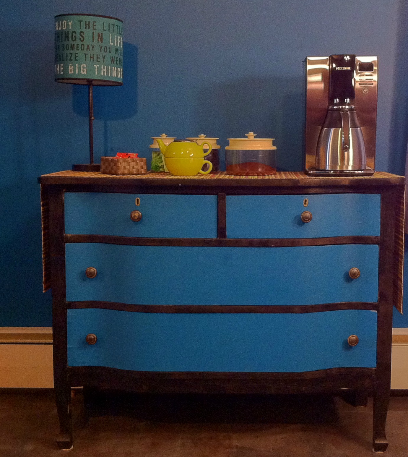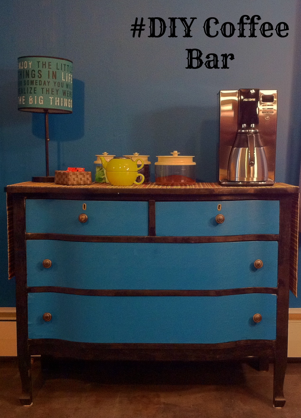 The brown and blue colors you chose are just wonderful! I really am envious of how beautiful your furniture transformation is! Love a good coffee bar.